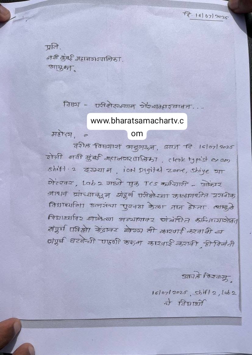 नवी मुंबई । ‘नवी मुंबई महानगरपालिका सरळसेवा भरती – 2025’ बाबत ऑनलाईन परीक्षेदरम्यान दि.16 जुलै 2025 रोजी, दुपारी 1 ते 3 वा. च्या परीक्षा सत्रात कोल्हापूर जिल्हयातील परीक्षा केंद्रावर उपस्थित पर्यवेक्षकामार्फत विद्यार्थ्यास परीक्षेच्या दरम्यान उत्तराचा पुरवठा केला गेल्याची तक्रार प्राप्त झाली होती. या तक्रारीची गंभीर दखल घेत तातडीने चौकशी करण्यात आली असून पर्यवेक्षकामार्फत एका उमेदवारास 2 ते 3 प्रश्नांची उत्तरे उमेदवाराने न विचारता पर्यवेक्षक सांगत असल्याचे सिसिटिव्ही चित्रीकरण पाहणी केली असता निदर्शनास आलेले आहे.